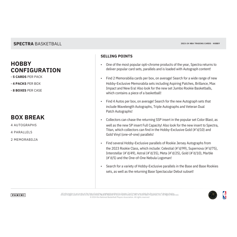 Inserts: - Collectors can chase after the popular returning SSP insert Color Blast, as well as the new SP insert Full Capacity! - Also search for Titan in Hobby-Exclusive parallels, which is new to Spectra this year!