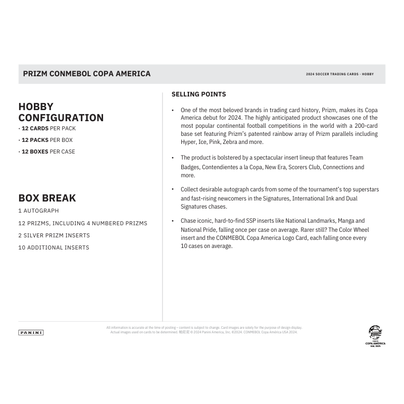 Base: - The highly anticipated 2024 Prizm CONMEBOL Copa America showcases one of the most popular continental football competitions in the world with a 200-card base set featuring Prizm’s patented rainbow array of Prizm parallels including Hyper, Ice, Pink, Zebra and more.
